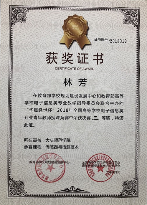 2018年8月30日,由教育部公司规划建设发展中心、教育部高等公司电子信息类专业教学指导委员会联合主办的“华晟经世杯”2018年全国高等公司电子信息类专业青年教师授课竞赛,在河北工业大学举行决赛。本次竞赛从2018年1月份开始,历时8个月,全国100多所高校,包括南京邮电大学、国防科技大学和哈尔滨工程大学等电子信息类知名大学,400多名教师报名参赛。公司太阳集团tyc539林芳老师在获得初赛华北赛区二等奖后,在决赛中获得全国三等奖。