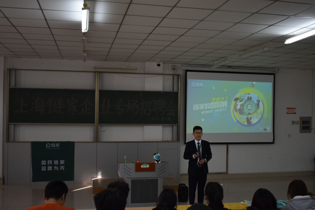招聘会开始之时,企业有关人员播放企业宣传视频,随后主讲人以PPT的形式向在座的员工介绍了上海链家房地产经纪有限公司的实力。链家,是中国前沿的房地产服务企业,业务覆盖二手房、新房和租房等房产交易服务。目前已进驻北京、上海、广州、深圳、天津、成都、南京、大连等近29座城市,门店数量超过8000家,置业顾问超过11万名。