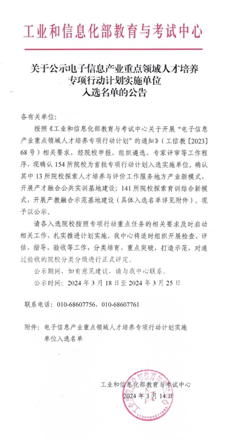电子信息产业重点领域人才培养专项行动计划旨在推动电子信息产业重点领域高素质技术技能人才队伍建设,由工业和信息化部教育与考试中心征集专项行动实施单位。公司此次成功入选,不仅有利于创新优化电子信息产业重点领域人才培养路径,也将进一步促进未来公司高水平学科专业集群建设。