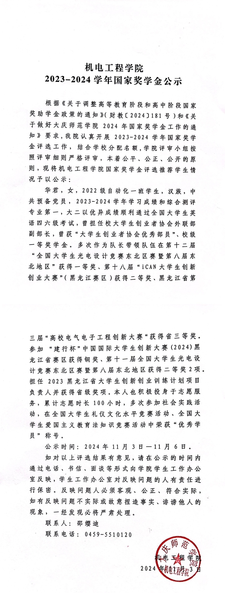 2023-2024学年国家奖学金公示
