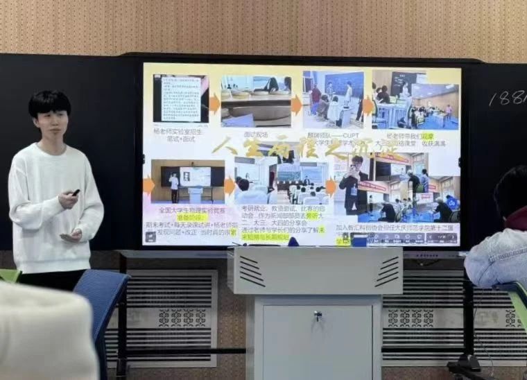 周宇航同学表示非常感谢物理学专业为师范生搭建学习和成长的平台、分享会也让学弟学妹们深刻体会到,成功需要兴趣、幸运、努力、机遇和老师指导,并且不要浮躁,脚踏实地。
